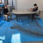 校務助手さんが、テニスコートのネットの破れを一針一針修繕されているのです。